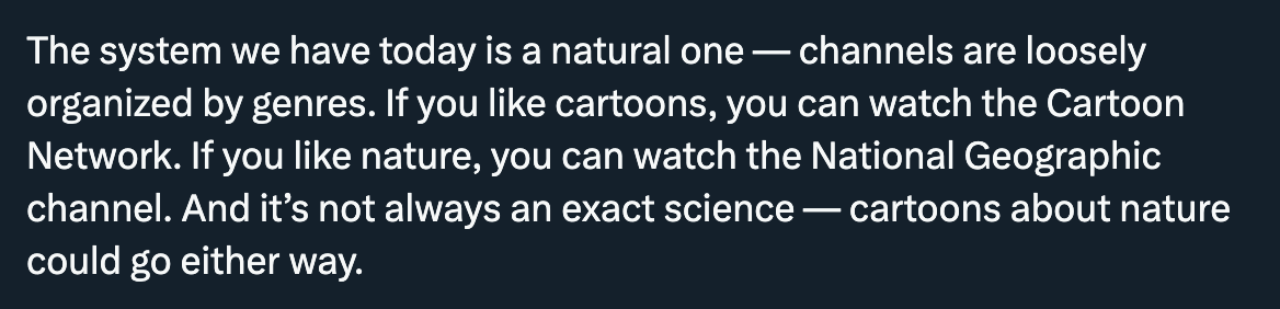 He frames the relationship between apps and rollups as similar to the relationship between TV shows and channels - “loosely organized by genres”.