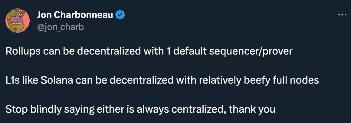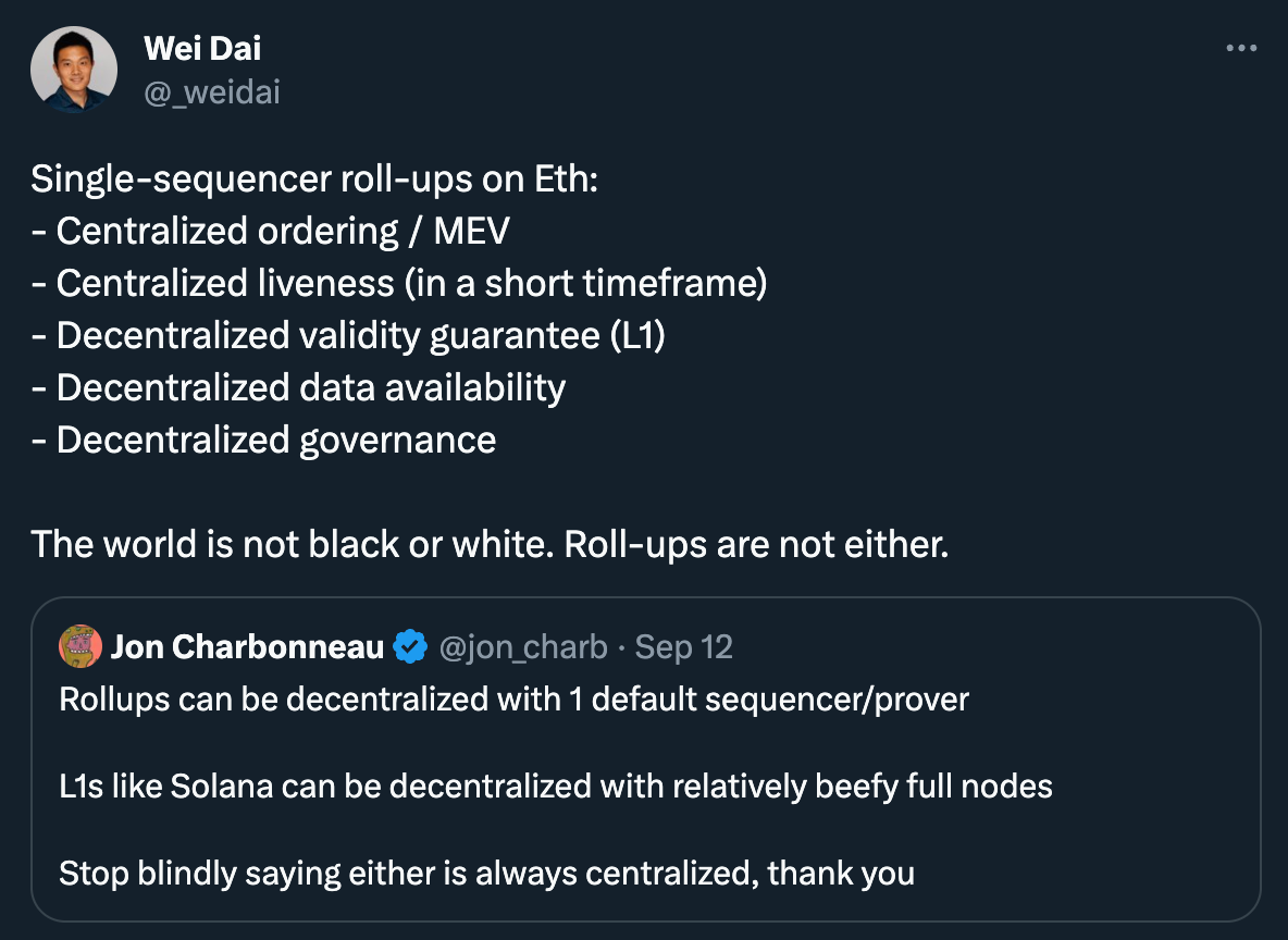 Here’s Jon and Wei Dai from 1kx making it very clear that rollup decentralization is multidimensional.