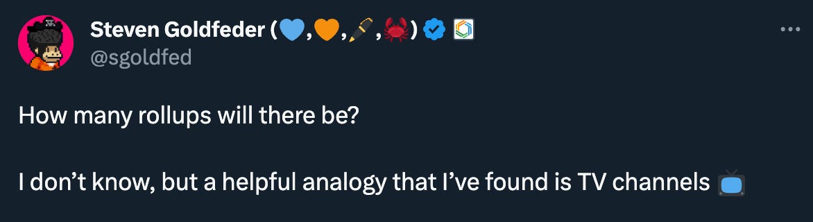 So, if Steven’s analogy is spot on and the future unfolds this way, how many rollups will there be? Of course, no one knows, but here are a few interesting takes: