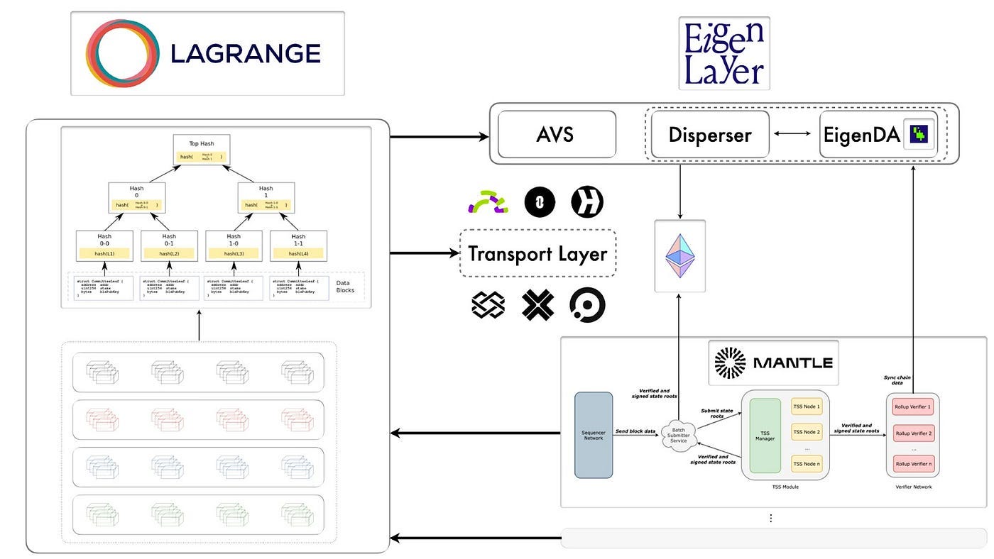 With Lagrange, a proof can be generated from a single block header, proving both an array of historical storage slot states at arbitrary depths and the result of a distributed computation executed on this state data. Lagrange’s ZK proofs are modular and can also be generated from any block header, even originating from existing cross-chain bridges and messaging protocols, making the solution entirely chain-agnostic. Lagrange state proofs, provided by EigenLayer-based proving network or State Committees, are also agnostic to the transport layer used to relay them to destination chains, which means that any interoperability protocol can integrate with Lagrange’s proving layer.
