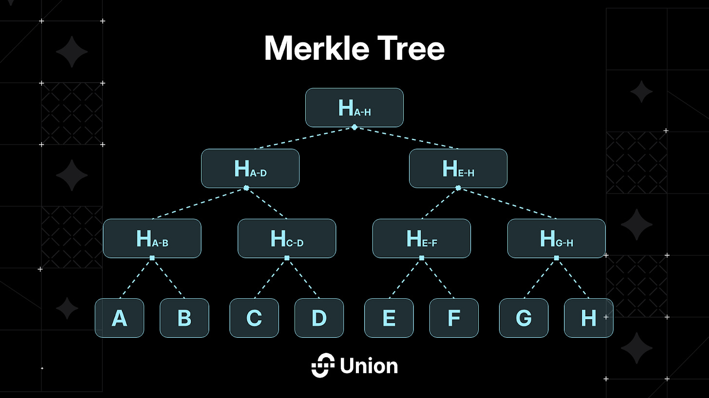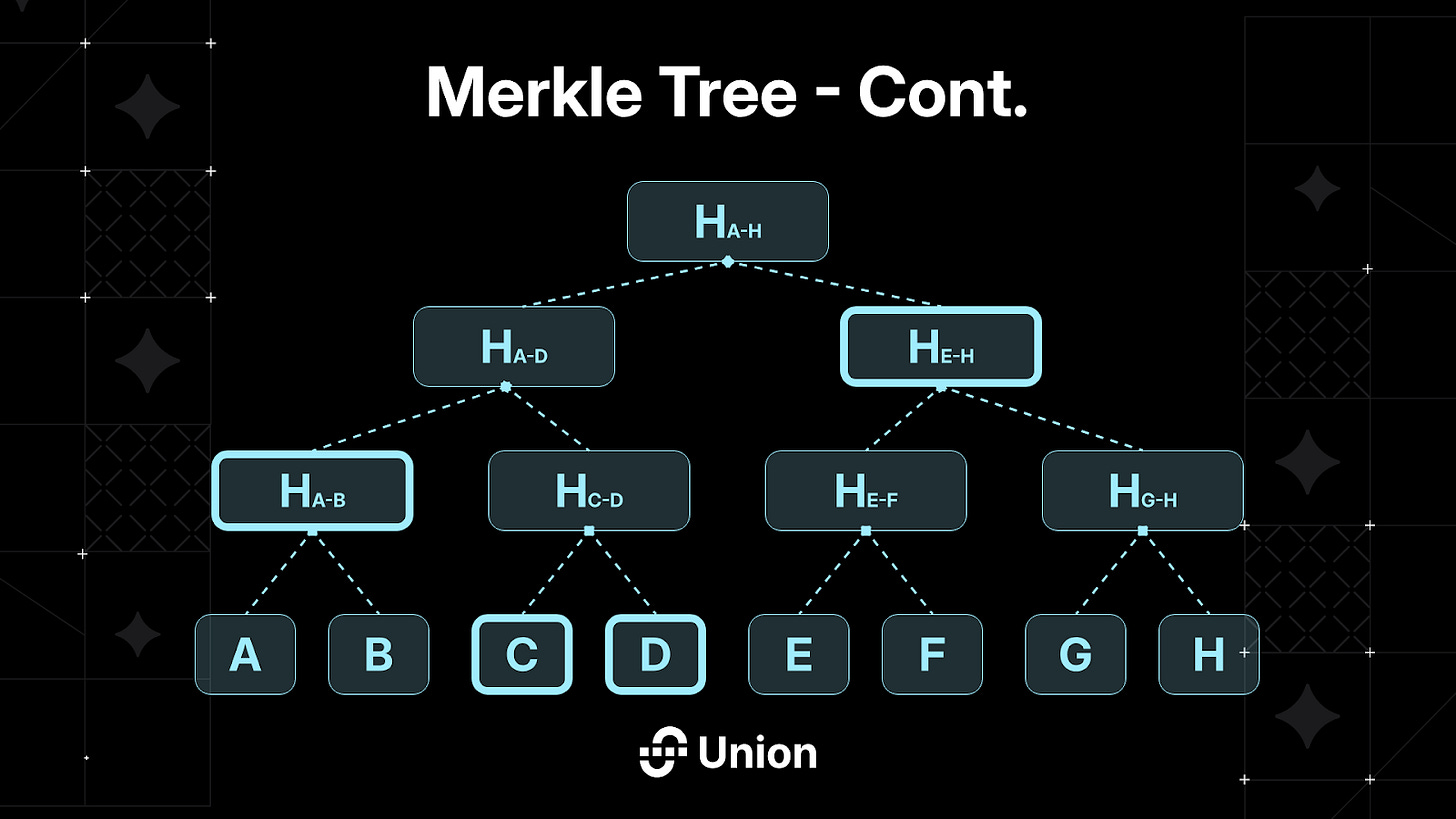 The top-of-the-tree root hash is the only on-chain storage necessity within a light client. Proving a particular value involves showing all associated hashes for combination towards the root. For instance, demonstrating C entails providing D, H(A-B), and H(E-H), significantly trimming the data required to verify a blockchain’s state.