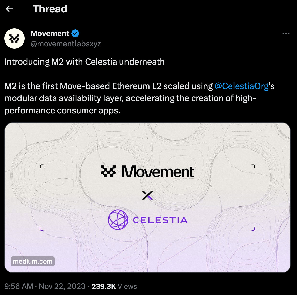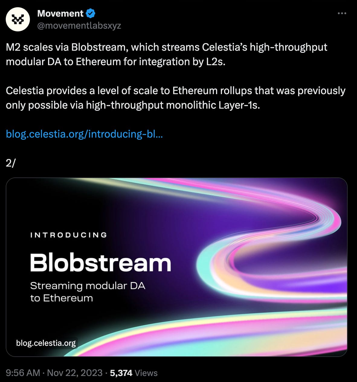 Movement Labs just unveiled M2, an Ethereum L2 network powered by the Move VM, and using Celestia for data publication, further helping reduce gas costs for end-users.