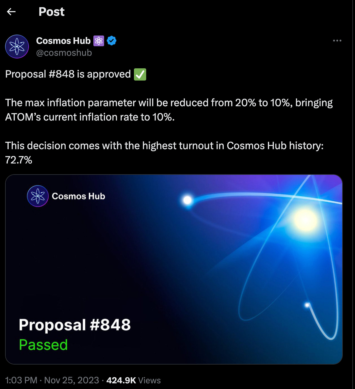 The Cosmos Hub community has decided - the max inflation parameter will be cut in half, from 20% to 10%.