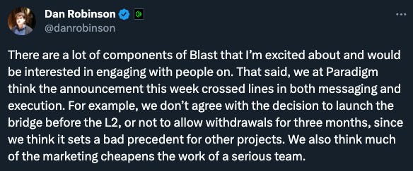 Even Paradigm, Blast’s lead investor, disagreed with how the L2 handled things (and they obviously like the idea)