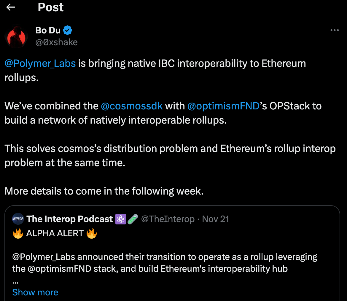 Initially, they intended to do this by building their own Cosmos SDK appchain (an L1) with an IBC connection to Ethereum, however, according to Polymer founder Bo Du, he thought the best way to gain adoption from Ethereum-aligned rollups was for Polymer itself to become an L2. Minimize trust.