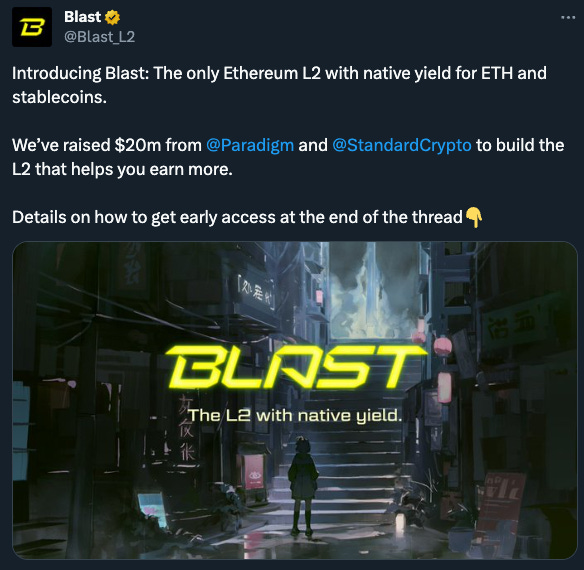 We won’t get into many details about Blast, because well, there aren’t many details available about Blast, but TLDR it’s a new L2 project that offers “native yield” on ETH and stablecoins. The idea is that, as a user, you earn yield when bridging into the network. This is accomplished by the Blast bridge lending your tokens to Lido and Maker to be used in their services, and passing the earned yield back to you. This increases capital efficiency relative to other L2s where locked tokens are sitting and not earning yield.